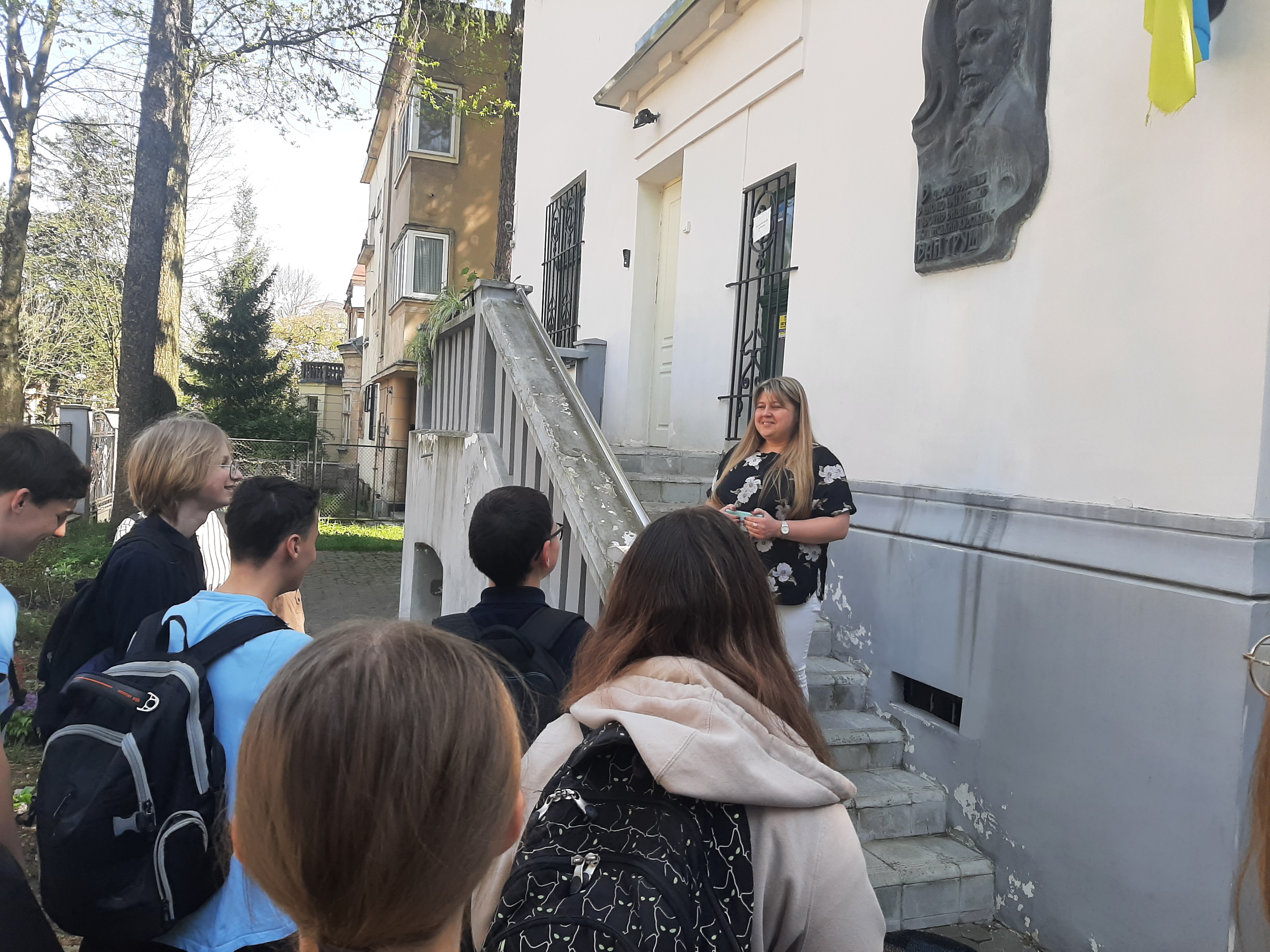 Гімназисти ознайомилися з садком де любив працювати художник, з будівлею "Білої вілли" або "Будинку за соснами", як його називали сучасники. Двоповерхова вілла у стилі пізньої сецесії була зведена по вулиці Обводовій (тепер — вулиця Івана Труша) за проектом львівського архітектора Олександра Лушпинського. Тут з 1910 до 1941 ріку художник мешкав разом із сім'єю.