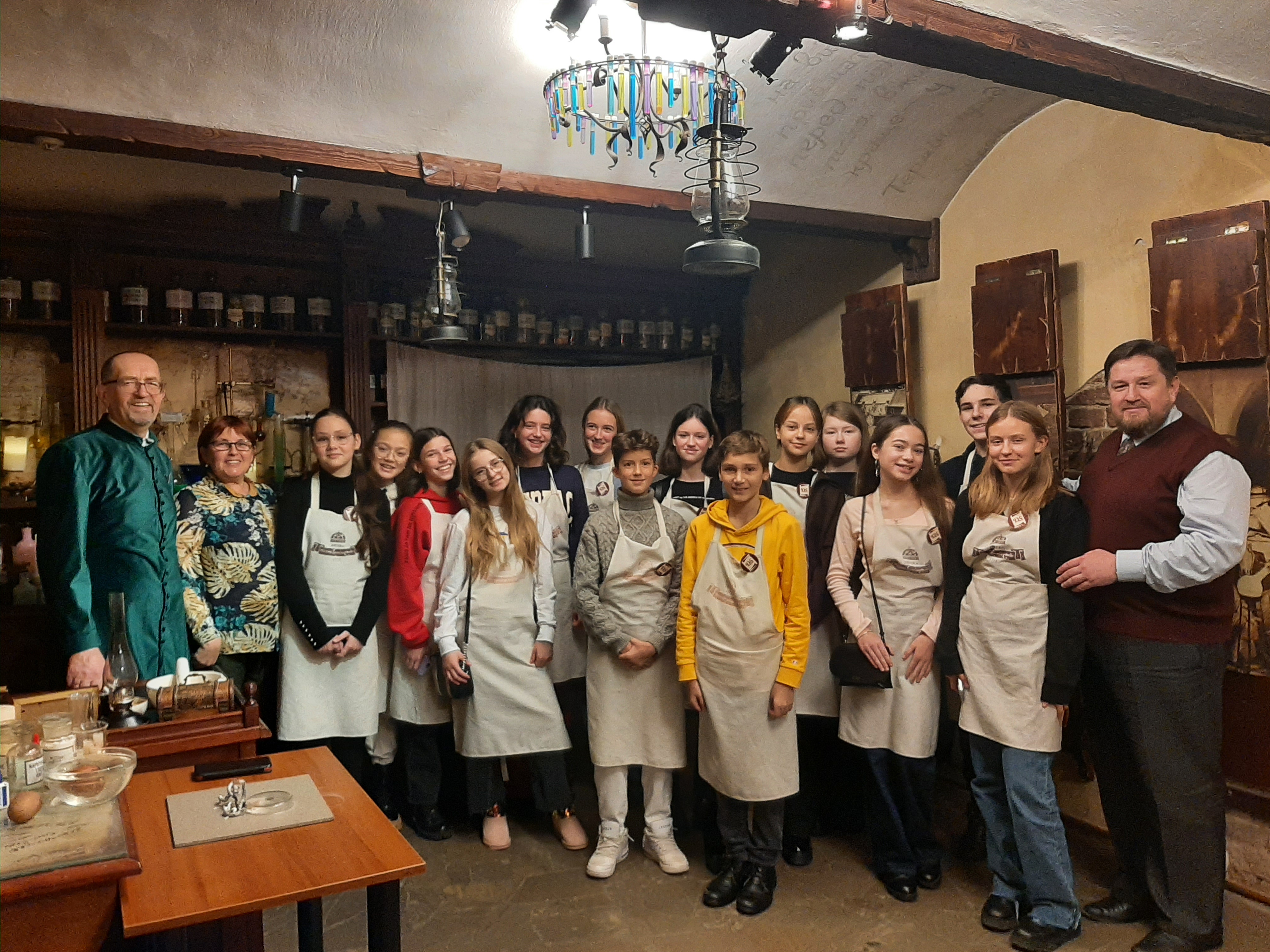 У колоритній атмосфері старовинного приміщення, за сприяння працівника аптеки п. Анатолія, семикласники пригадали правила безпечного поводження у лабораторії та види лабораторного посуду, довідалися про застосування хімічних і фізичних явищ у фармації, про способи незвичного використання звичних речовин, про цілющі властивості деяких лікарських рослин, спробували себе у ролі рекламних агентів.