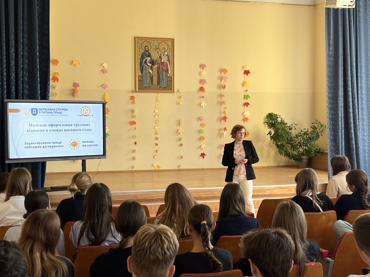 оформлення трудових відносин в умовах воєнного стану". Під час сесії учні переглянули презентацію та ознайомилися із буклетами щодо особливостей працевлаштування неповнолітніх. В кінці зустрічі учні отримали відповіді на свої запитання.