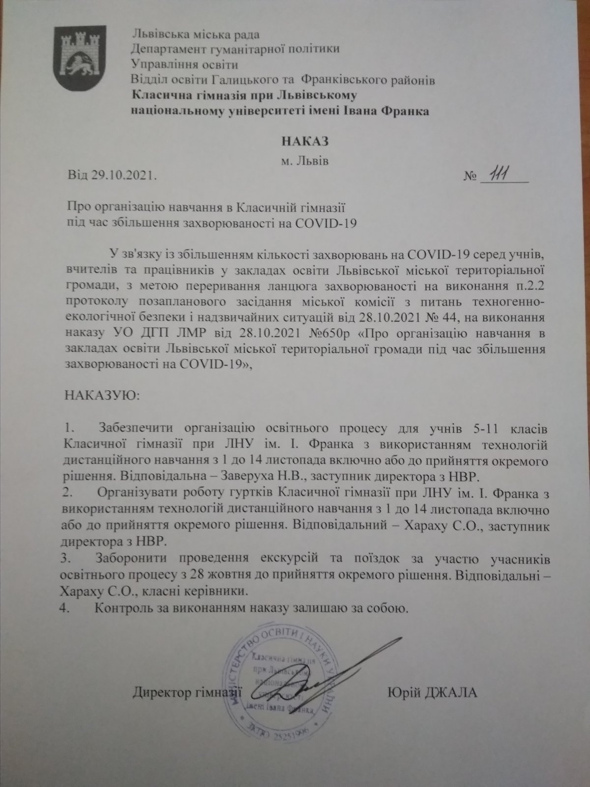 Про організацію навчання в гімназії під час збільшення захворюваності на COVID-19