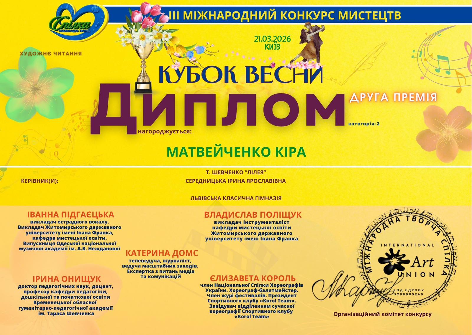 21 березня 2026 року у Києві проходив III Міжнародний конкурс мистецтв «Кубок весни». У його частині «Художнє читання» взяла участь учениця 5-Б класу Матвейченко Кіра. Для виступу Кіра вибрала твір Тараса Шевченка «Лілея». Надзвичайно ніжне, витончене, проникливе читання, романтичний образ стрункої білої лілеї, втаємничена мелодія, щирість голосу підкорили журі. В підсумку учениця здобула другу премію.