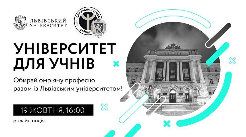 19 жовтня 2020 року ЛНУ запрошує на онлайн-подію «Університет для учнів», де разом з психологічною службою Університету та Львівським центром зайнятості розкажемо про те, як важливо психологічно налаштуватись абітурієнту та батькам до підготовки та здачі зовнішнього незалежного оцінювання, та як обрати «свою професію».