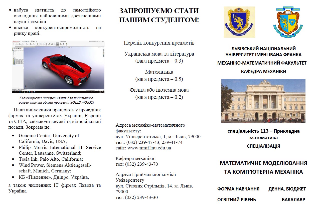 Здібних до математики учнів 10-11 класів запрошуємо на спеціальність 113 – прикладна математика (спеціалізація “Математичне моделювання та комп’ютерна механіка”), форма навчання – денна, освітній рівень – бакалавр.