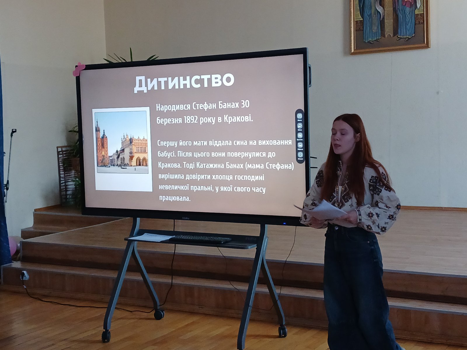 У рамках проведення конференції "Наука рідною мовою" 11 березня учні 10-х класів: Ганушевська Ярина, Греділь Валерія, Городинська Анна-Марія, Доскоч Софія, Житло Тереза, Тузяк Наталя презентували науково-дослідницькі роботи на тему: "Левицький Володимир Йосипович - видатний український математик", "Львівська математична школа Стефана Банаха", "Вклад Казимира Бартеля в розвиток української математичної науки", "Мирон Зарицький та його родина". Роботи були змістовними і справді зацікавили слухачів.