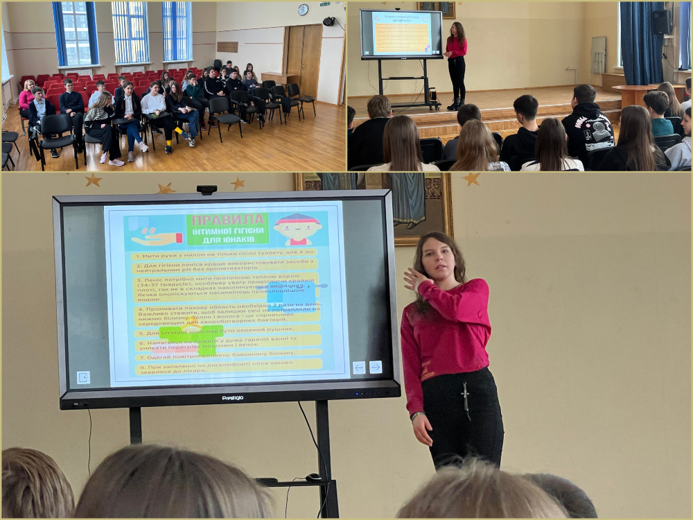 Николин Богданна, студентка ВНПЗ Львівського медичного фахового коледжу "Монада", волонтер-медик в Медико-психологічній допомозі на залізничному вокзалі, волонтер проекту "Почуй лікаря" 6 квітня для учнів 8-Б провела інформаційну презентацію про статеве дозрівання.