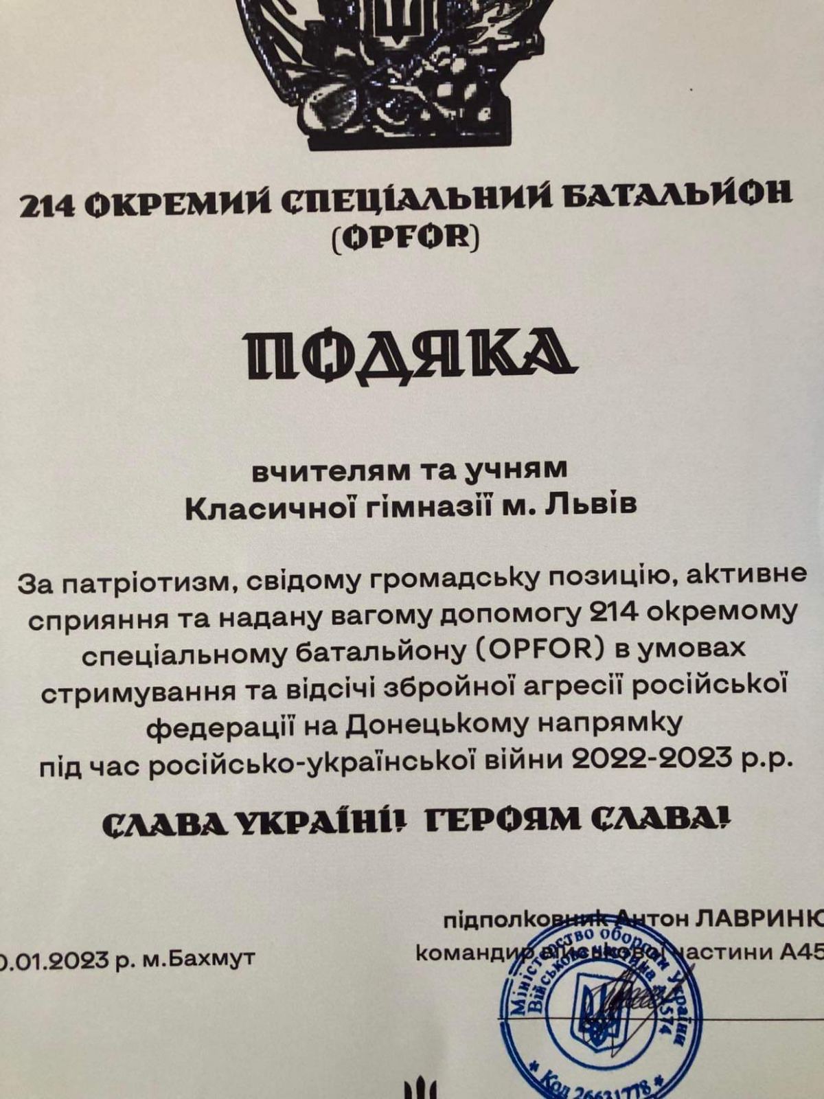 Спорядження воїни отримали, за що висловили Подяку нашій гімназійній громаді та вчительці Кладовій І.П.!