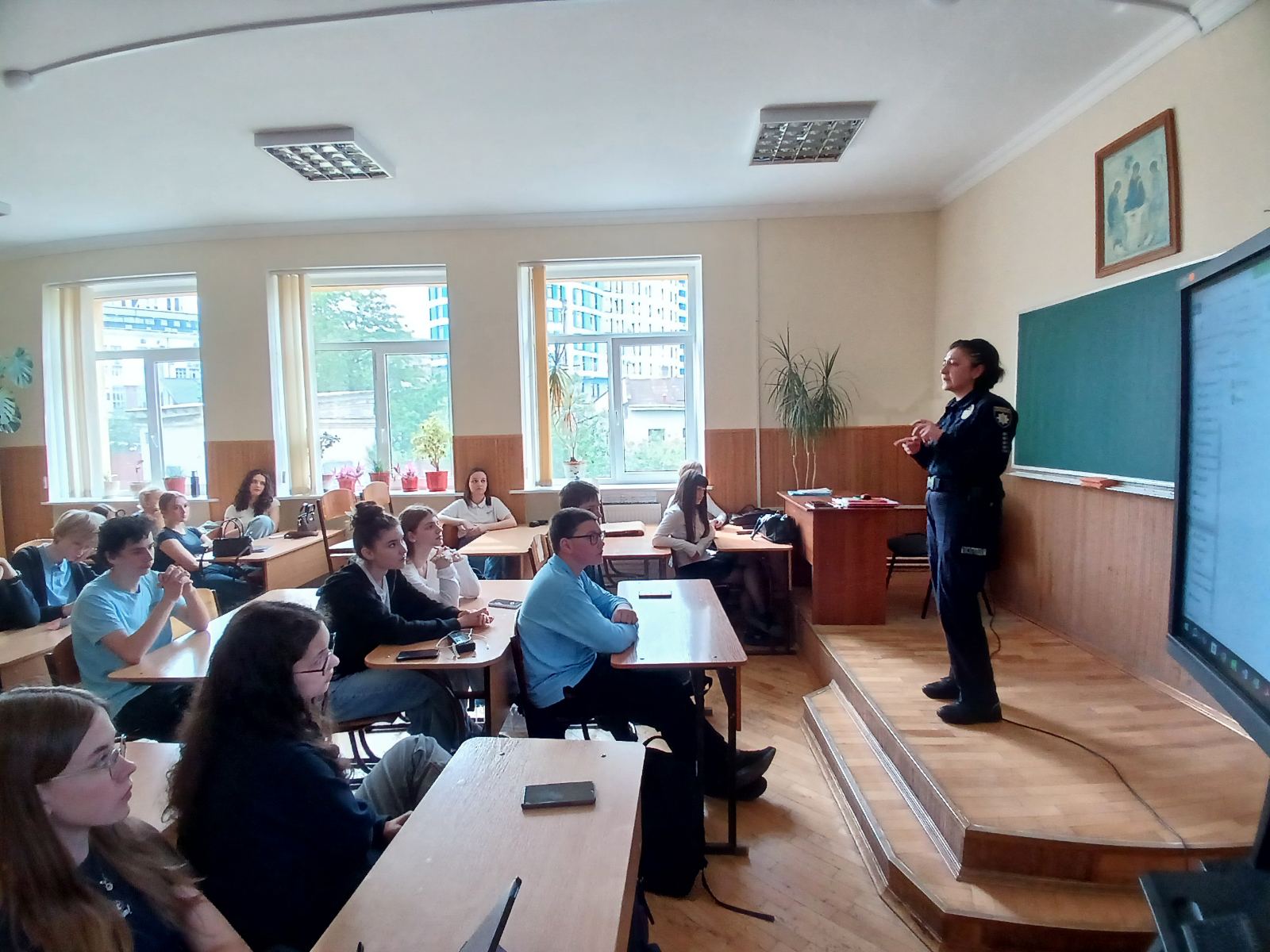 На уроці Основи здоров'я офіцер поліції Андріана Ковалишин у 9-их класах провела лекцію про рівні, види і заходи безпеки, про засади національної безпеки України, про глобальні небезпеки. Переглянули відео про ядерне бомбардування Хіросіми та Нагасакі, про аварію на ЧАЕС, про Скнилівську трагедію та теракт 11 вересня 2001 року у США. Учні обговорювали наслідки технічного прогресу і глобальні загрози, породжені життєдіяльністю людини.