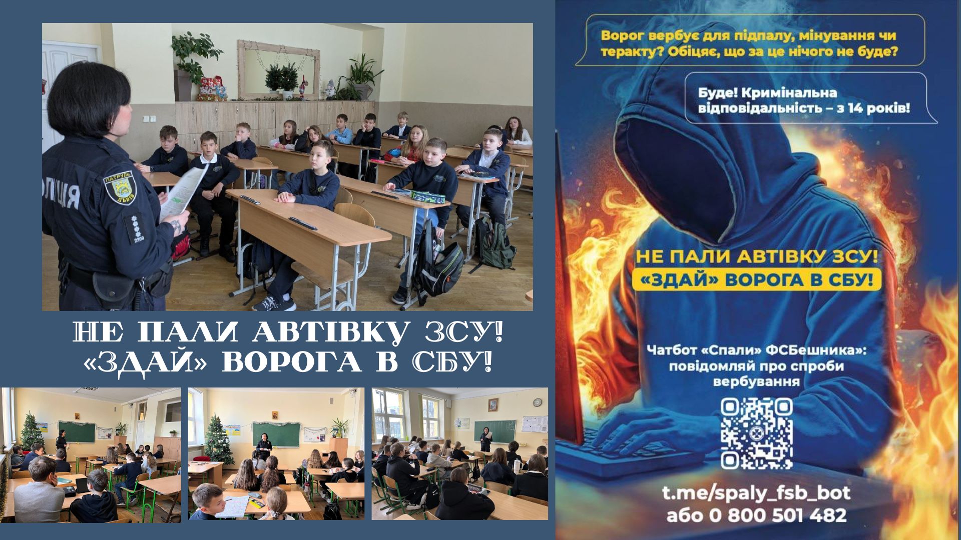 Якщо тобі або твоїм знайомим пропонують підпалити авто ЗСУ чи адмінбудівлю, влаштувати теракт чи мінування – одразу пиши нам! Не допомагай ворогу руйнувати оборону твоєї країни!