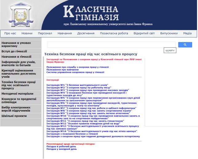 4 листопада 2021 р. фахівець з охорони праці гімназії Мізюнов О. М. провів для педагогічних працівників гімназії онлайн-майстерку з питань охорони праці у гімназії. Під час заходу опрацювали короткий зміст інструкцій з безпеки життєдіяльності та охорони праці, що опубліковані на сайті гімназії, обговорили рекомендації щодо поїздок та екскурсій, а також довели до відома усіх алгоритм дій учителів у разі нещасних випадків з учнями.