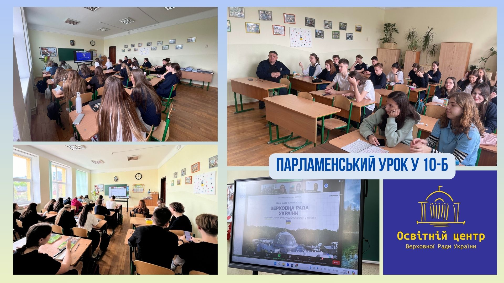 17 квітня учні 10-Б класу, разом із Залужним А.П., взяли участь в інтерактивному парламентському онлайн-уроці, який організував Освітній Центр Верховної Ради України. На уроці учні ознайомилися із тим, як працює Верховна Рада України, зі структурою та функціями єдиного законодавчого органу влади.