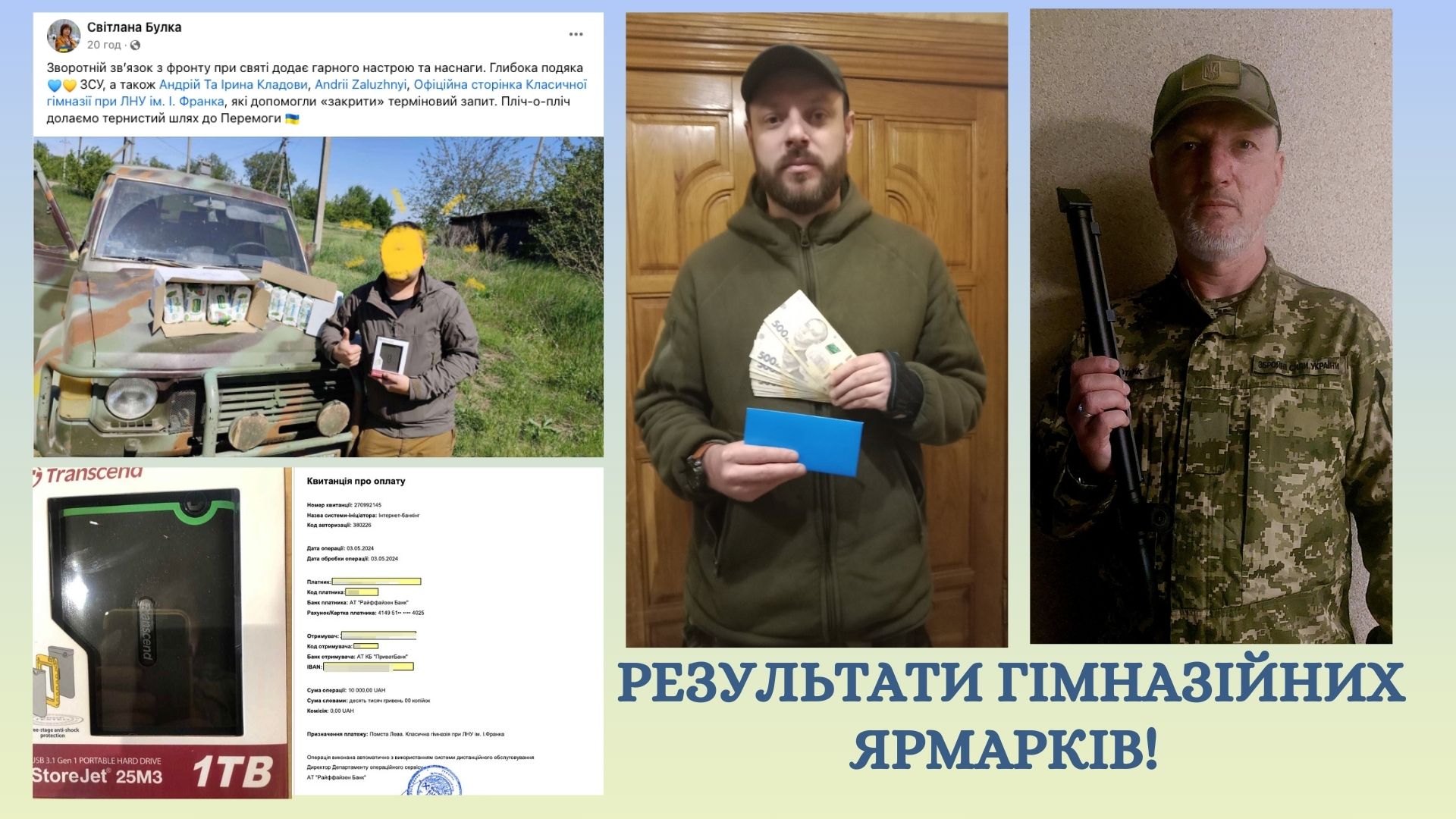 - Світлані Булці, волонтеру з якою співпрацює гімназія. (30 квітня кошти в сумі 10 тис. грн. були передані п. Світлані).