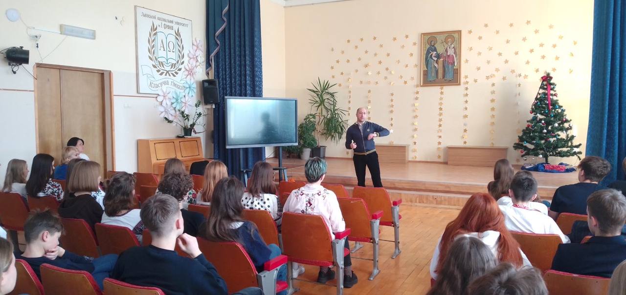 Гарною зустріччю з талановитим львівським істориком, к.і.н, доцентом, завідувачем кафедри історії, музеєзнавства і культурної спадщини Національного університету Львівська Політехніка, Іваном Хомою, розпочали гімназисти 9,10 класів та вчителі тиждень заходів, приурочених до Дня Соборності, 106 річниці проголошення незалежності УНР. Бесіда була дуже цікавою, адже події столітньої давності нині здаються напрочуд актуальними. Говорили про незасвоєні уроки революції, про проблеми молодої української держави, про те, чому тоді, в ході революції, ми зазнали такої трагічної поразки. Розмовляли про те, наскільки сильними ми є нині, наскільки важливим є усвідомлення процесу, що призвів до історичного об'єднання українських земель. Чому ці питання залишаються актуальними і сьогодні. Торкнулися безумовно постаті Євгена Коновальця, саме дослідженню його діяльності Іван Ярославович вважає справою свого життя. Завершили позитивними настановами науковця, впевненою вірою в нашу перемогу і повернення усіх українських земель. Прикметно, що ворог, що так намагається завдати нам якнайбільшої шкоди, не зміг завадити важливій історичній бесіді та рефлексії.